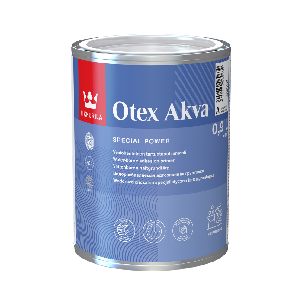 Tikkurila Otex Akva Primer: Fast-drying water-based adhesion primer. \n \nCharacteristics: Suitable as a base coat and intermediate layer for clean and previously painted surfaces. Strong adhesion to challenging surfaces like glass, tiles, fiberglass, melamine, PVC plastic, aluminum, zinc-coated metal, and surfaces with alkyd or acid-based coatings. Also suitable for wood, fiberboard, chipboard, and metal surfaces in dry indoor spaces. Not recommended for maintaining surfaces coated with nitrocellulose lacquer. \n\nShades: White and light tones according to the Tikkurila Symphony color chart. \n\nGloss Level: Matte. \n\nConsumption: 6–8 m²/l, depending on surface texture, porosity, and application method.