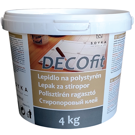 DECOFIT adhesive is designed for bonding styrofoam ceiling and wall panels, insulation wallpapers, and decorative trims in interior spaces. White water-soluble compound, suitable for sanding and painting. Recommended application temperature is between +10°C and +20°C, with a drying time of 24 hours. Frost-resistant and intended for indoor use only. Average consumption is approximately 300 g/m². Available in 1.6 kg and 4 kg packages.