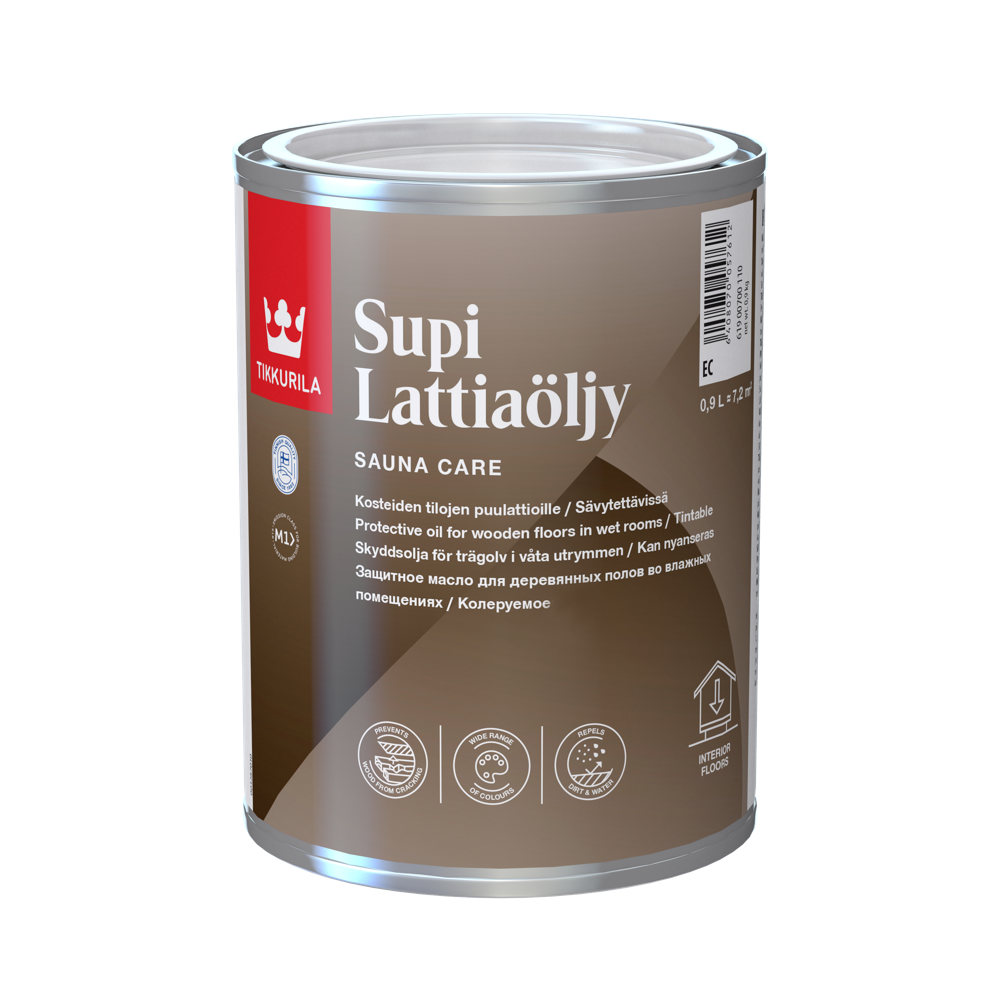 Tikkurila Supi Floor Oil: Vodorazredivo ulje za drvene podne površine u vlažnim prostorijama. Karakteristike: Koristi se na drvenim podovima i daskama u vlažnim prostorijama, bilo netretiranim ili prethodno premazanim uljem. Pogodno za termički obrađeno i tvrdo drvo. Nijansa: Bezbojna, nijanse dostupne prema Tikkurila Interior Wood Stains and Lacquers ton karti. Potrošnja: 8–15 m²/l, u zavisnosti od poroznosti površine. Napomena: Tretman uljem potamnjuje drvenu površinu.
